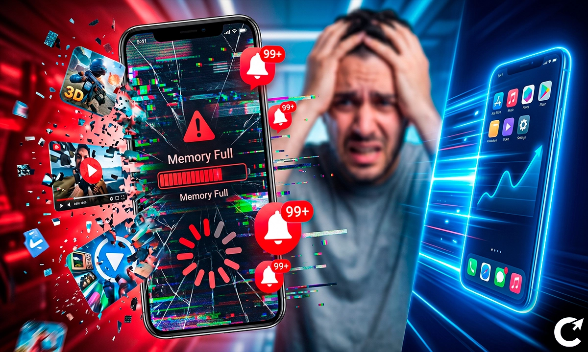 Muitas pessoas culpam apenas o armazenamento cheio, mas o verdadeiro vilão costuma ser a soma de três fatores: